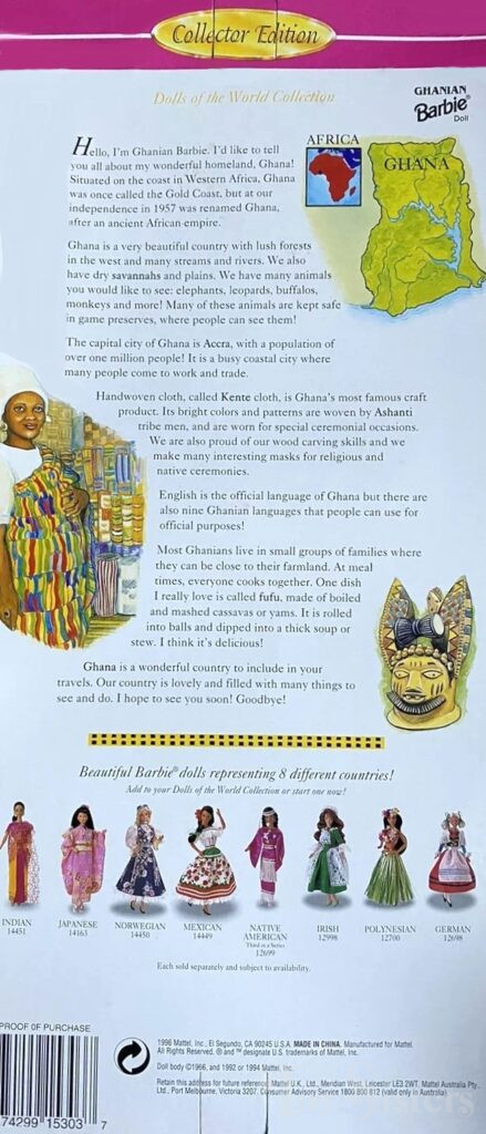 Ghanian Barbie is part of the Dolls of the World series (DOTW). To see the other Dolls of the World from 1996, click here. To see all the other Dolls of the World, click here.