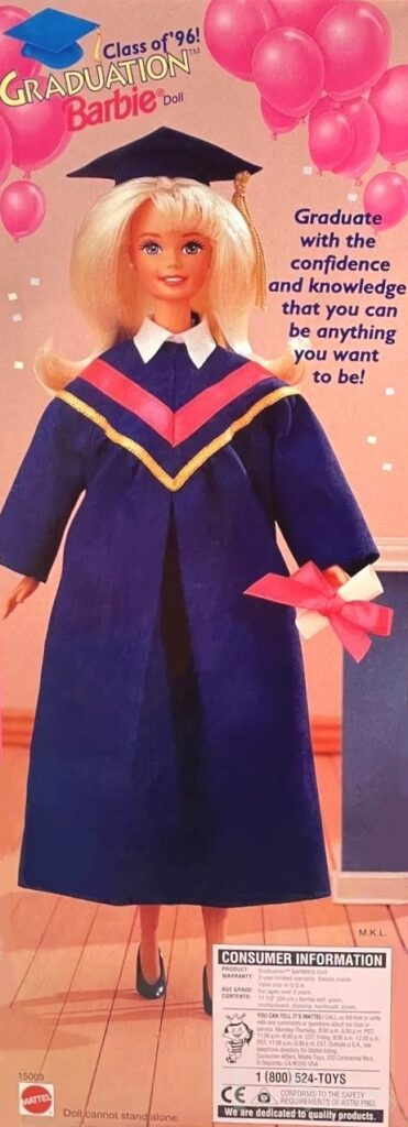 This doll was copyrighted / released in 1996. To see other dolls from 1996, click here. She has the Superstar head mold. To see other dolls with this head mold, click here. This doll was manufactured in Malaysia. To see other graduation dolls, click here.