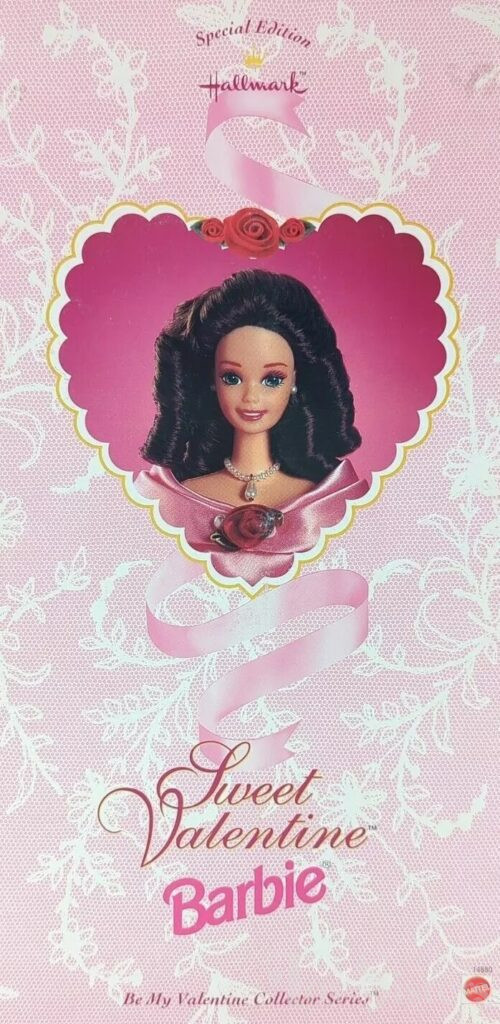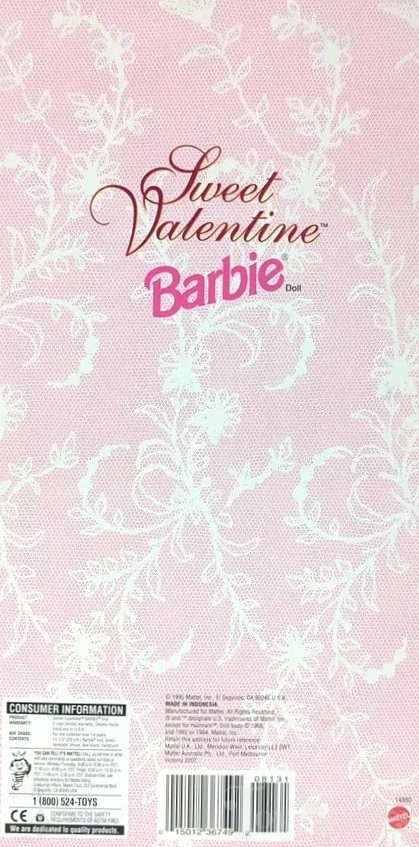 This doll was copyrighted / released in 1995 / 1996. To see other dolls from 1996, click here. She has the Superstar head mold. To see other dolls with this head mold, click here. This doll was manufactured in Indonesia. She was a Hallmark exclusive. To see other Hallmark dolls, click here. To see other Valentine dolls, click here.