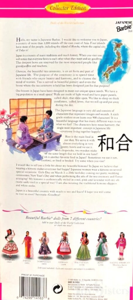 Japanese Barbie is part of the Dolls of the World series (DOTW). To see the other Dolls of the World from 1996, click here. To see all the other Dolls of the World, click here.