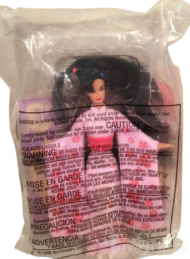 This doll was copyrighted / released in 1995 / 1996. To see other dolls from 1996, click here. She has the Kira head mold. To see other dolls with this head mold, click here. This doll was manufactured in China. She was also released in a 3-Pack (#15283).