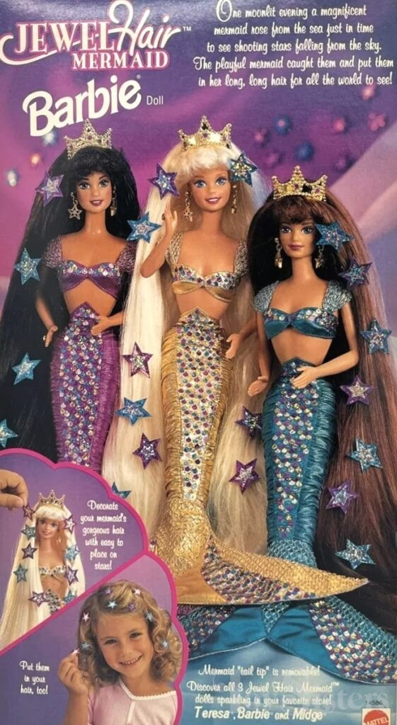 This doll was copyrighted / released in 1995 / 1996. To see other dolls from 1996, click here. She has the Superstar head mold. To see other dolls with this head mold, click here. This doll was manufactured in China, Indonesia, or Malaysia and there are discernible differences between the three. To see other Jewel Hair Mermaid dolls, click here. To see other mermaid dolls, click here.