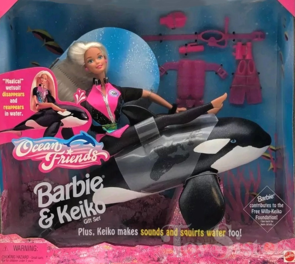 This doll was copyrighted / released in 1995 / 1996. To see other dolls from 1996, click here. She has the Superstar head mold. To see other dolls with this head mold, click here. This doll was manufactured in China. Ocean Friends dolls come with aquatic pets and feature color-changing legs that can make their wetsuits “magically” appear. Barbie also came packaged with adult Keiko the whale in gift set #16214. To see other Ocean Friends dolls, click here. To see all other Barbie beach dolls, click here.