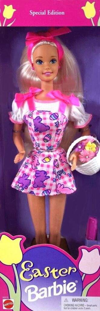 This doll was copyrighted / released in 1996 / 1997. To see other dolls from 1997, click here. She has the Superstar head mold. To see other dolls with this head mold, click here. This doll was manufactured in Indonesia and was also released in an AA version. To see other Easter Barbie dolls, click here.