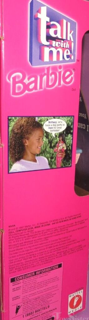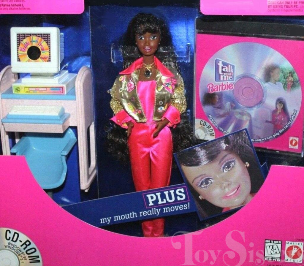 This doll was copyrighted / released in 1997. To see other dolls from 1997, click here. She has a very rubbery head mold that is unique to her and the Caucasian version of this doll that allows them to “talk”. This doll was manufactured in China.