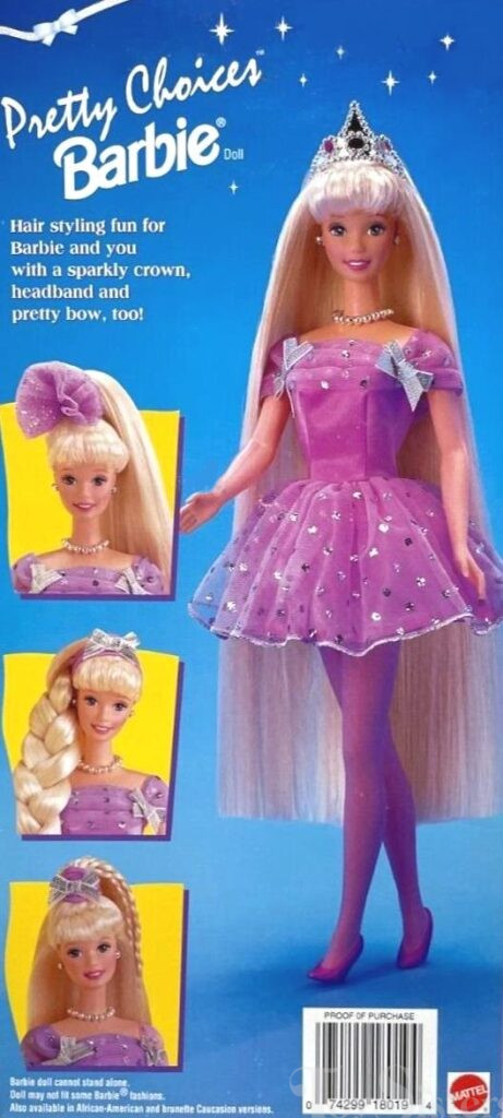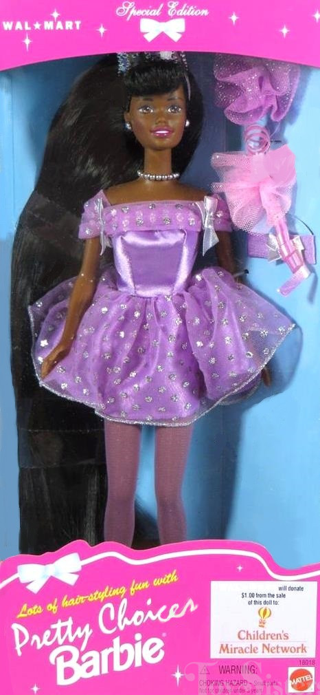 This doll was copyrighted / released in 1996 / 1997. To see other dolls from 1997, click here. She has the Christie head mold. To see other dolls with this head mold, click here. This doll was manufactured in Indonesia and also came in a brunette version and a blonde version. These dolls were Walmart exclusive and their sale benefited the Children’s Miracle Network.