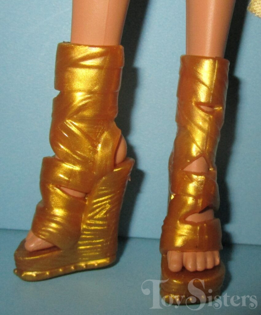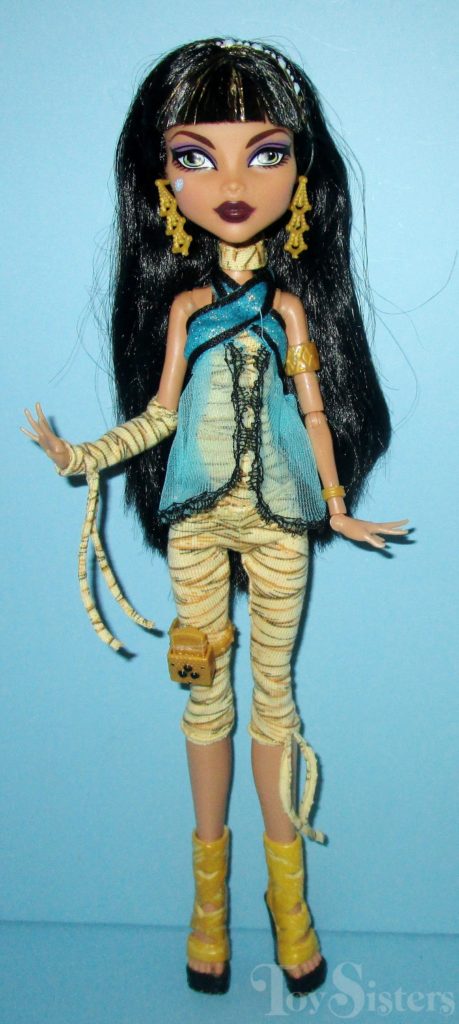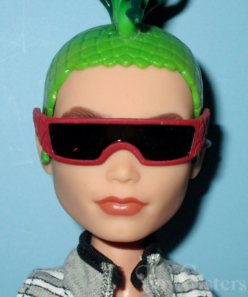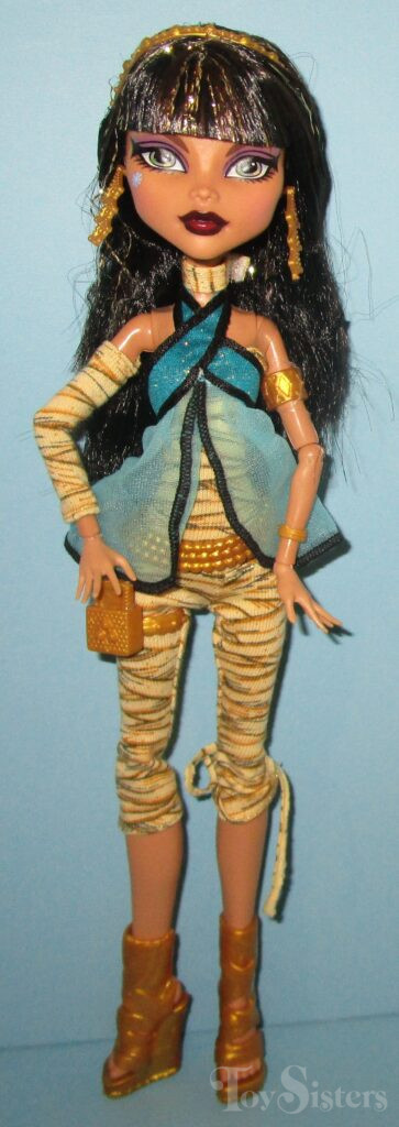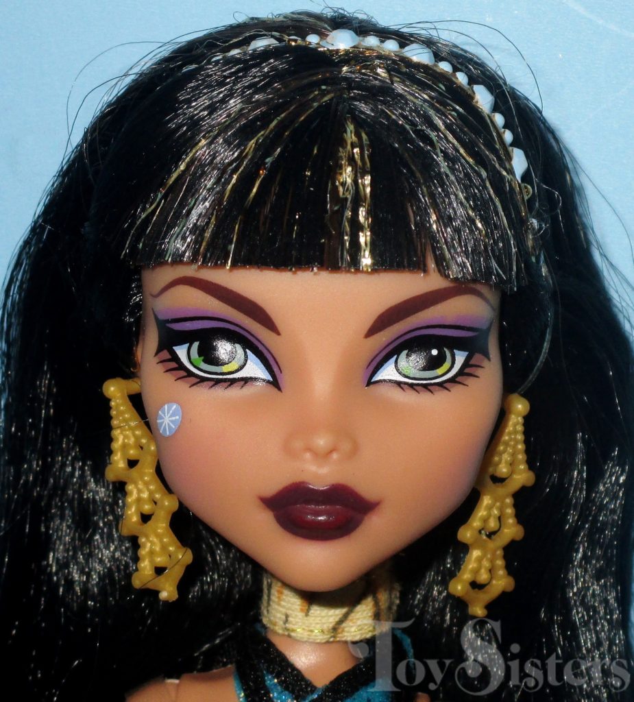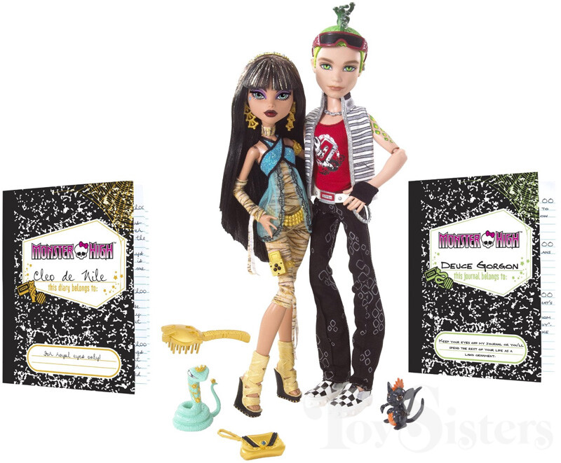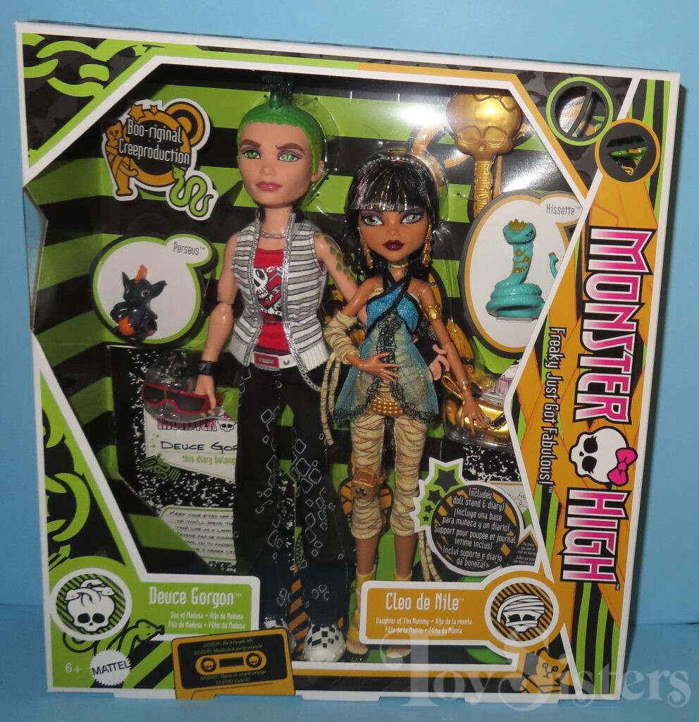 Signature Cleo de Nile and Deuce Gorgon were first released in 2010. They were made in Indonesia. They came with Cleo’s pet cobra (Hissette) and Deuce’s pet rat (Perseus). They also came with stands, diaries, Deuce’s sunglasses, and Cleo’s purse. To see the other releases of these Monster High characters click here for Cleo or here for Deuce.