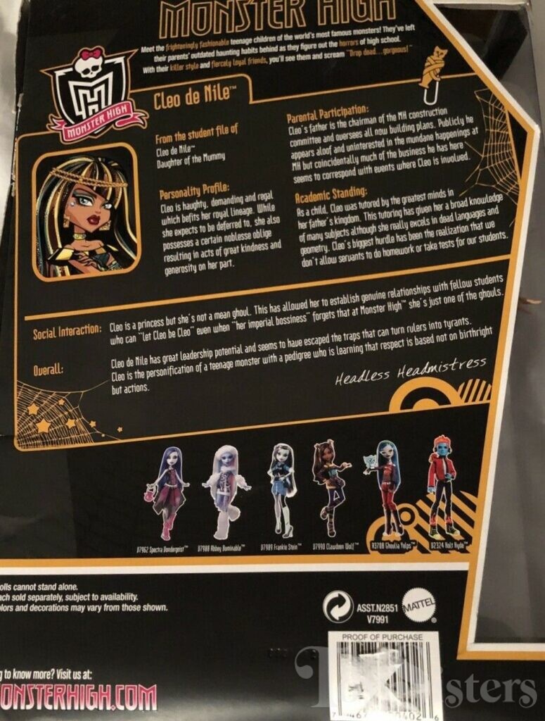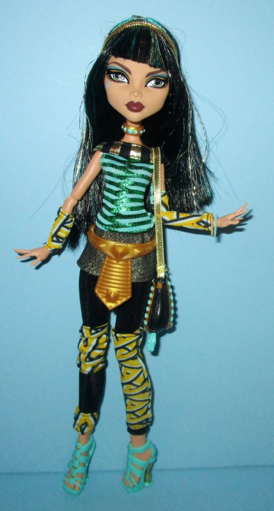 Back to School/School’s Out Cleo de Nile was released in 2011. She was made in China. She came with a binder, purse, diary, yellow stand, and yellow brush. To see other releases of the Monster High character Cleo de Nile, click here.