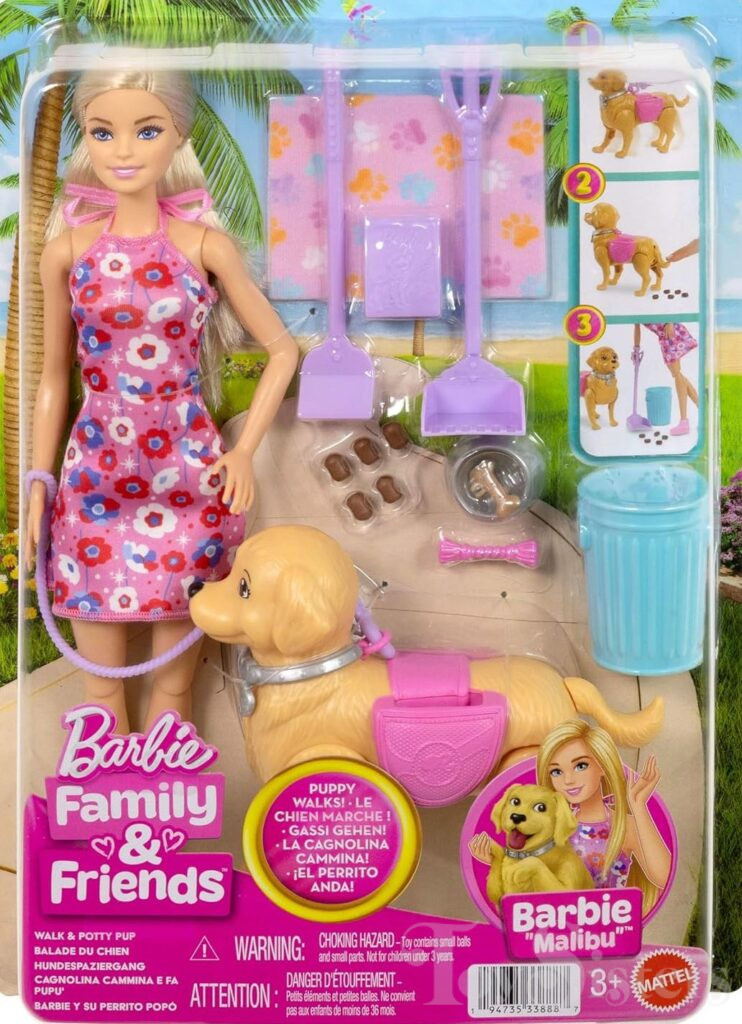 2025 Barbie Family & Friends Walk & Potty Puppy Clean-Up Malibu Doll & Dog (JJB46)