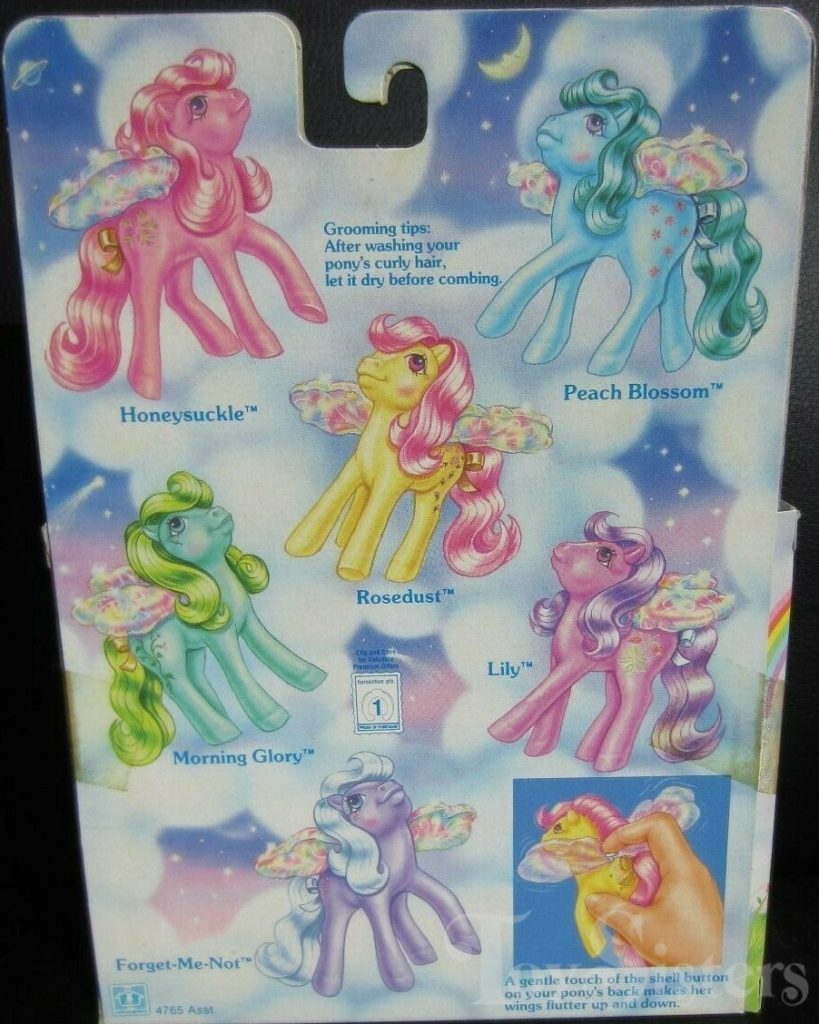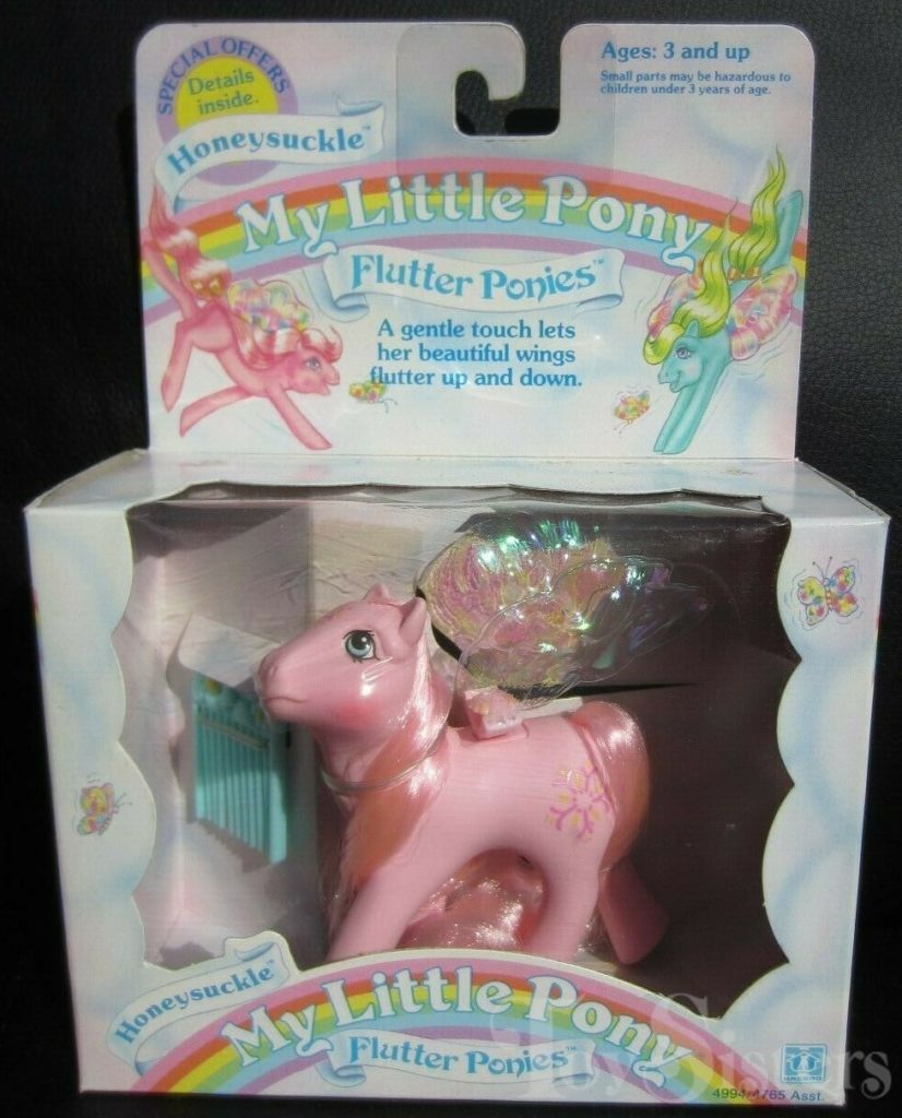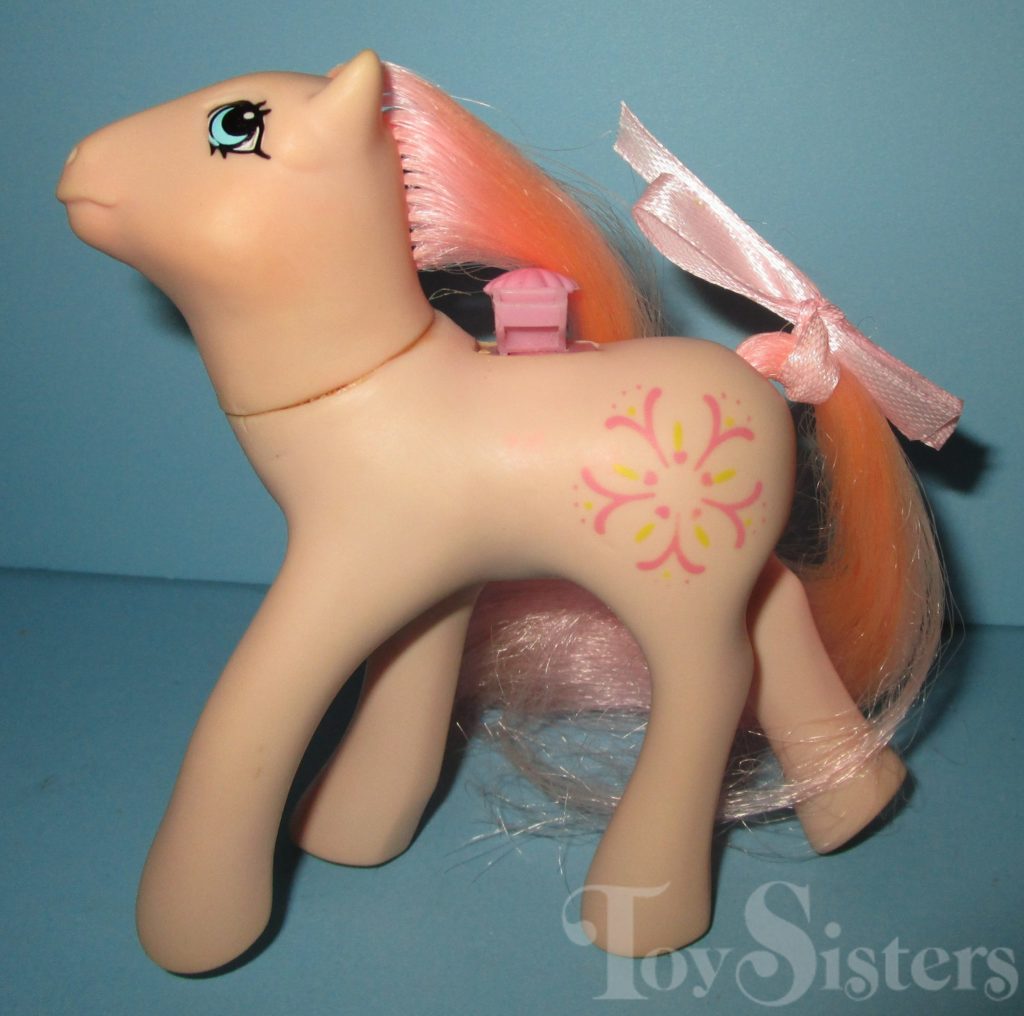 Honeysuckle was released in 1986 and is a Flutter Pony. Flutter Ponies came with wings, but usually these have broken off the pony and been lost. She came with a green flower pick and silver ribbon. She is in the Peach Blossom Pose. To view other ponies by year/series, click here.