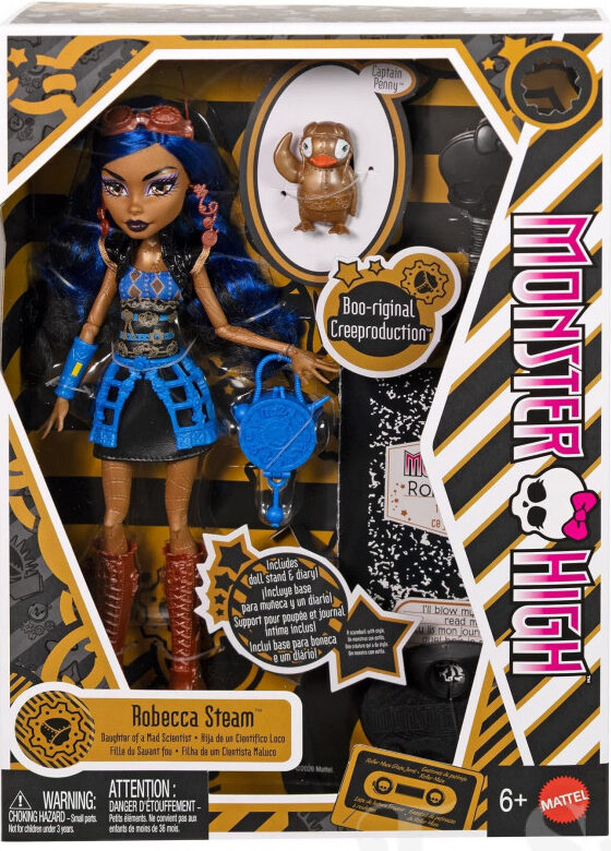 Signature Robecca Steam was released in 2012. She came with a purse, diary, stand, brush, and pet penguin (Penny). She was made in Indonesia. In 2026, a Boo-Original Creeproduction was released. To see other versions of the Monster High character Robecca Steam, click here.