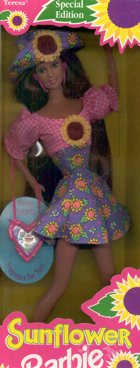 The Barbie Sunflower series was copyrighted in 1994 and released in 1995. The series includes Barbie and Teresa wearing sunflower-inspired ensembles.