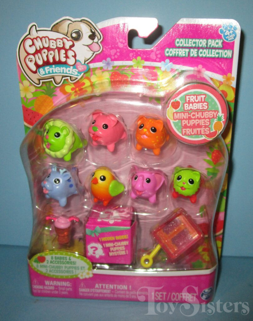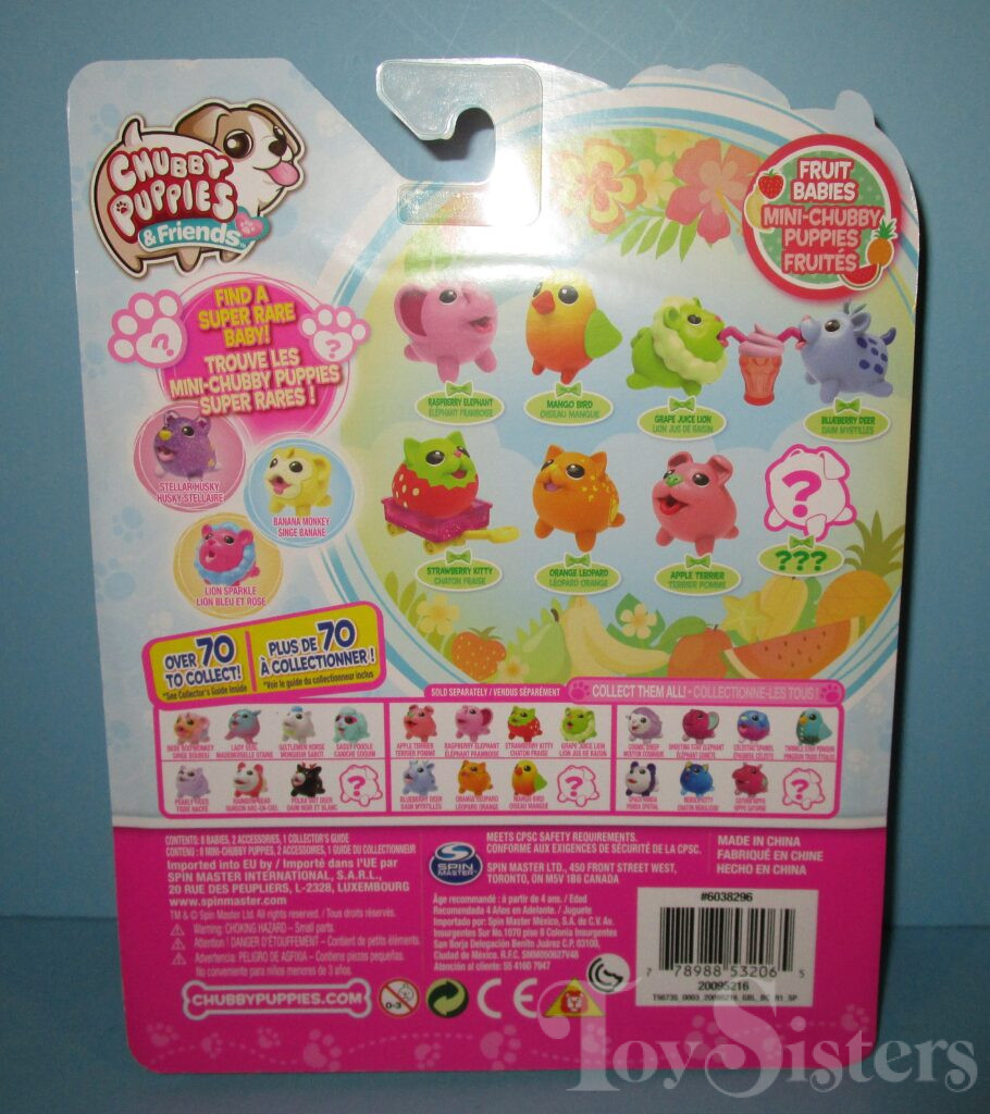 Grape Juice Lion, Apple Terrier, Orange Leopard, Strawberry Kitty, Blueberry Deer, Mango Bird, and Raspberry Elephant came in a Collector Pack together. Watermelon Bear also comes in this pack as the mystery pet unless a rare pet is in its place instead. If you were lucky enough to get a rare pet, you could have found Banana Monkey. To see other Mini Chubby Puppies, click here. To see other Mini Chubby Kitties, click here. To see other Mini Chubby Bears, click here. To see other Mini Chubby Deer, click here. To see other Mini Chubby Birds, click here. To see other Mini Chubby Monkeys, click here. To see other Mini Chubby Lions, click here. To see other Mini Chubby Elephants, click here. To see other types of Chubby Puppies and Friends, click here.