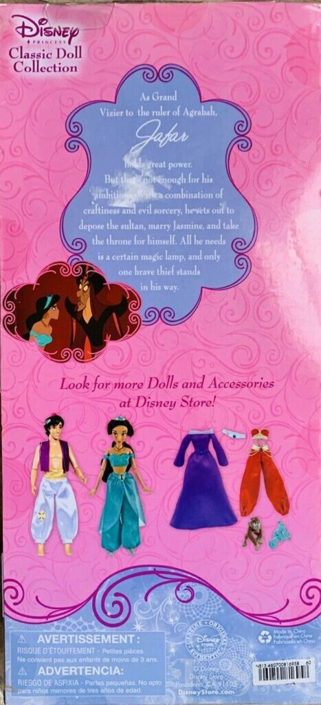 This doll is similar to the following single Jafar release, except this release has more painted details on its face/chin (as does the multipack version). To return to Disney Store Style 3 Aladdin dolls, click here. To see other types of Aladdin dolls, click here. To return to the main Disney Doll menu, click here.