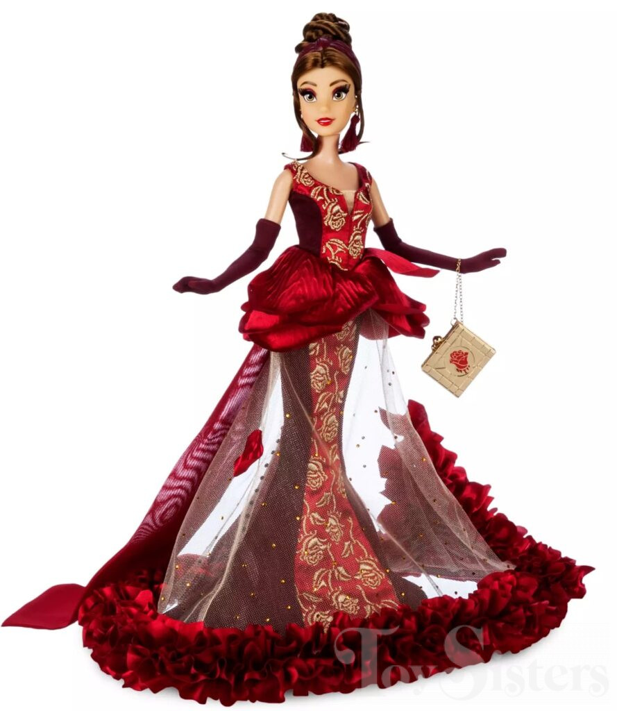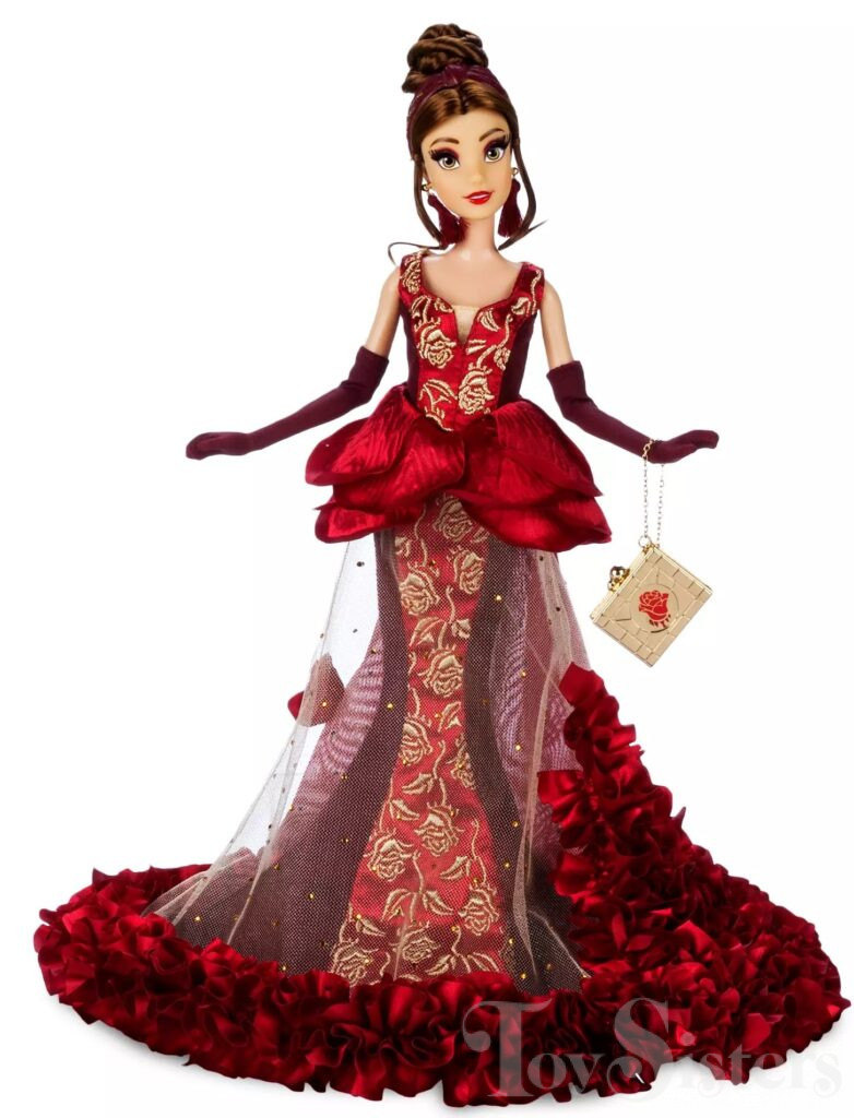 This Designer doll was released on DisneyStore.com in 2022. She was also later available at Disney Parks. The Disney Designer Collection dolls wear outfits designed by Disney Store Designers for the Disney Princess Celebration. Belle was designed by Heidi Ticehurst and had a limited edition size of 9800 dolls. The Disney Store also sold a pin featuring the doll’s design (sold separate from the doll):
