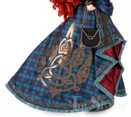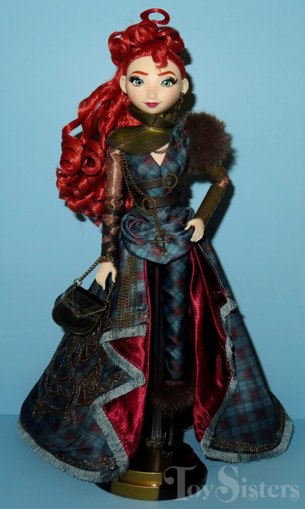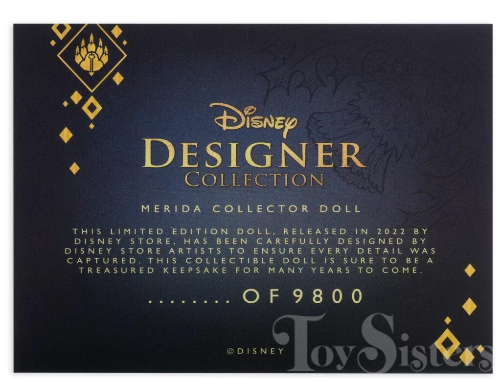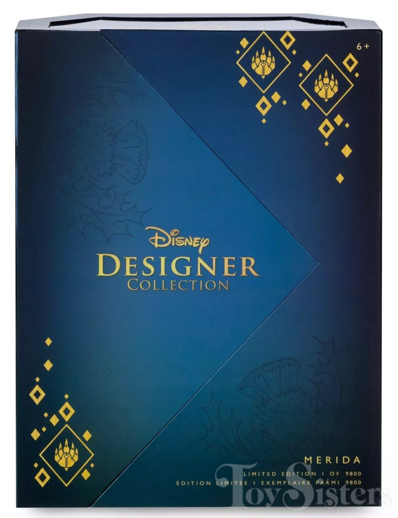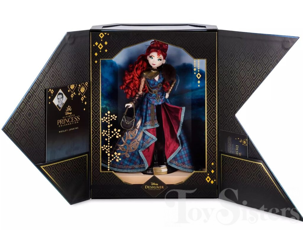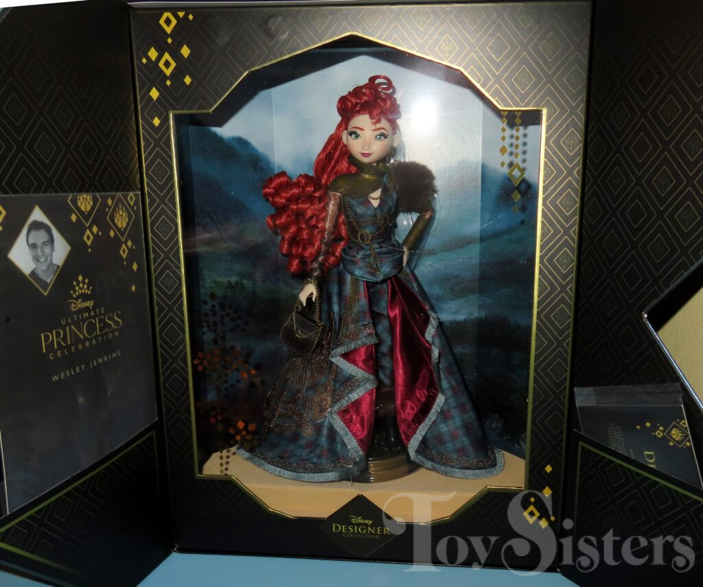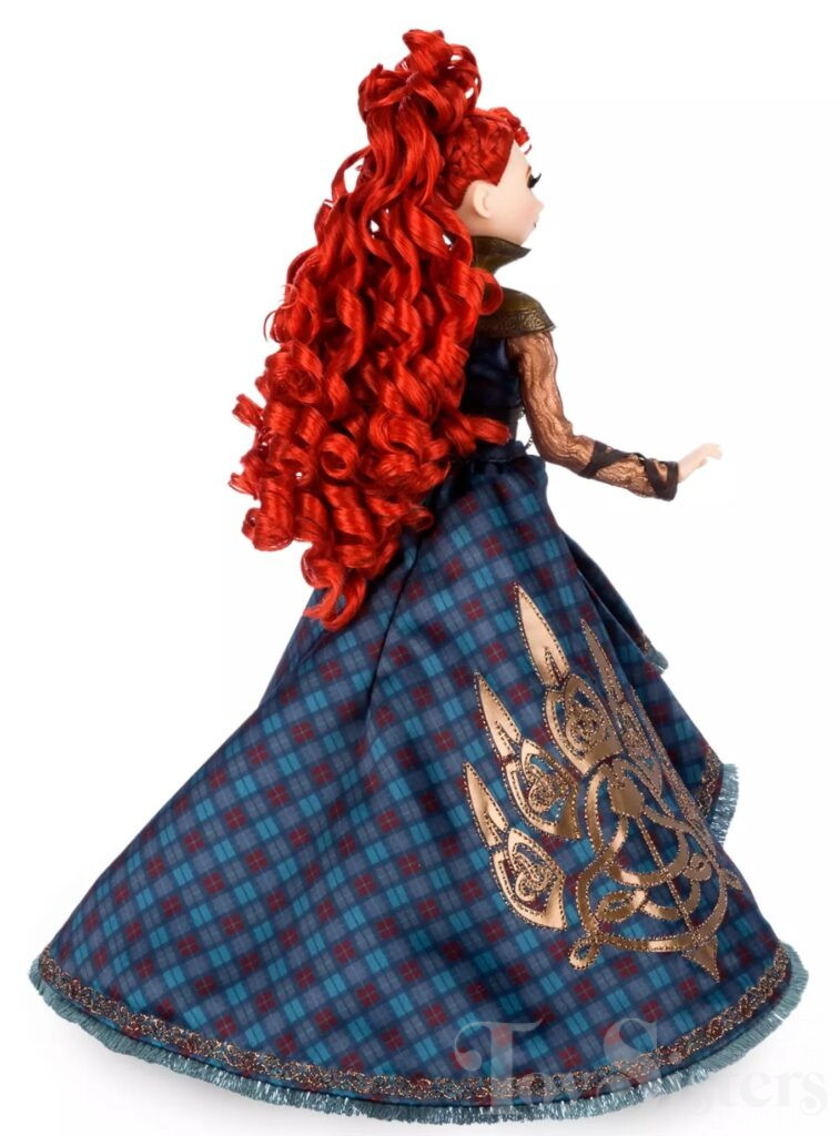 This Designer doll was released on DisneyStore.com in 2022. She was also later available at Disney Parks. The Disney Designer Collection dolls wear outfits designed by Disney Store Designers for the Disney Princess Celebration. Merida was designed by Wesley Jenkins and had a limited edition size of 9800 dolls. The Disney Store also sold a pin featuring the doll’s design (sold separate from the doll).