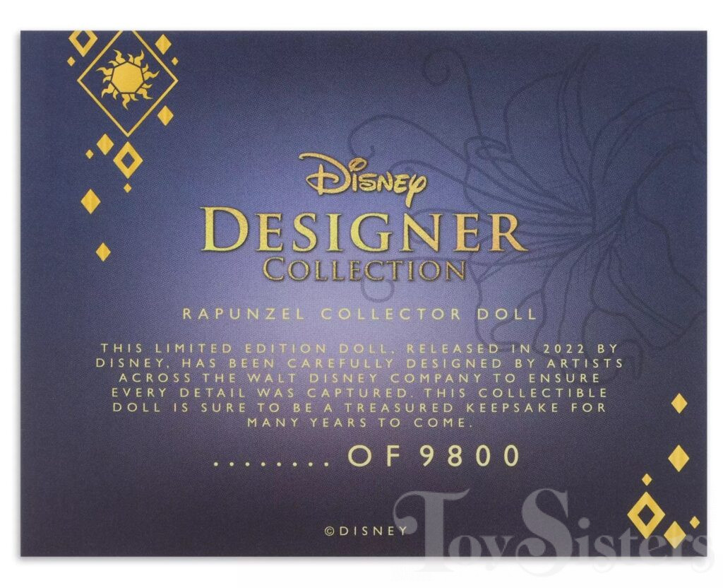 This Designer doll was released on DisneyStore.com in 2022. She was also later available at Disney Parks. The Disney Designer Collection dolls wear outfits designed by Disney Store Designers for the Disney Princess Celebration. Rapunzel was designed by Tetsunosuke Saiki and had a limited edition size of 9800 dolls. The Disney Store also sold a pin featuring the doll’s design (sold separate from the doll).