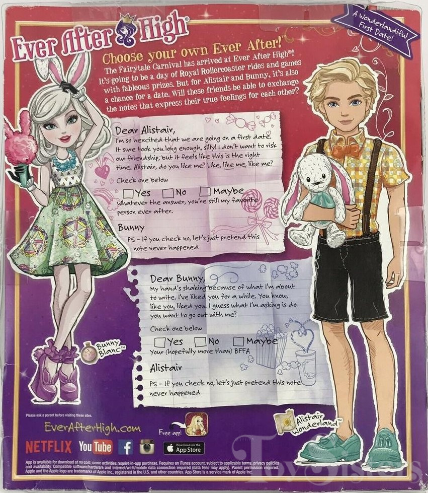 Carnival Date Alistair Wonderland & Bunny Blanc were released in 2016. To view other Alistair Wonderland dolls, click here. To view other Bunny Blanc dolls, click here. To view other Ever After High dolls By Year, click here.