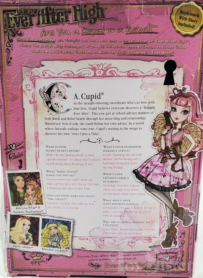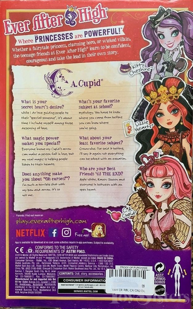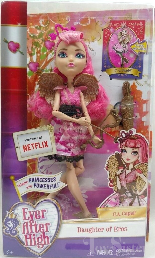 First Chapter C.A. Cupid was released in 2013. In 2016 she was released again in a new box style. This version came with less accessories. To view other C.A. Cupid dolls, click here. To view other Ever After High dolls By Year, click here.