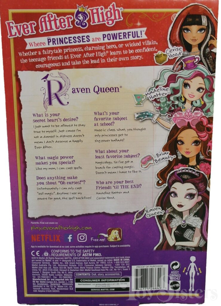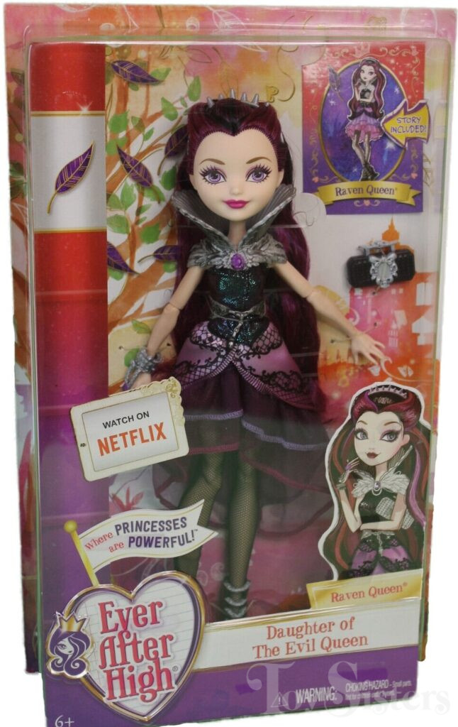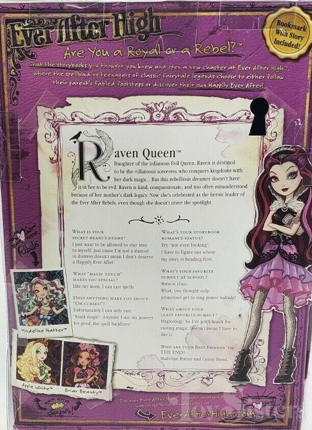 First Chapter Raven Queen was released for the first time in 2013. In 2016 she was released again in a new box style. Later in 2016, she was released with a new updated head mold. To view other Raven Queen dolls, click here. To view other Ever After High dolls By Year, click here.