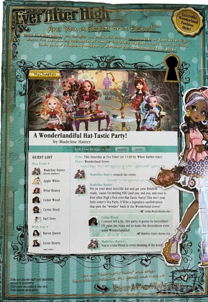 Hat-Tastic Cedar Wood was released in 2014. To view other Cedar Wood dolls, click here. To view other Ever After High dolls By Year, click here.