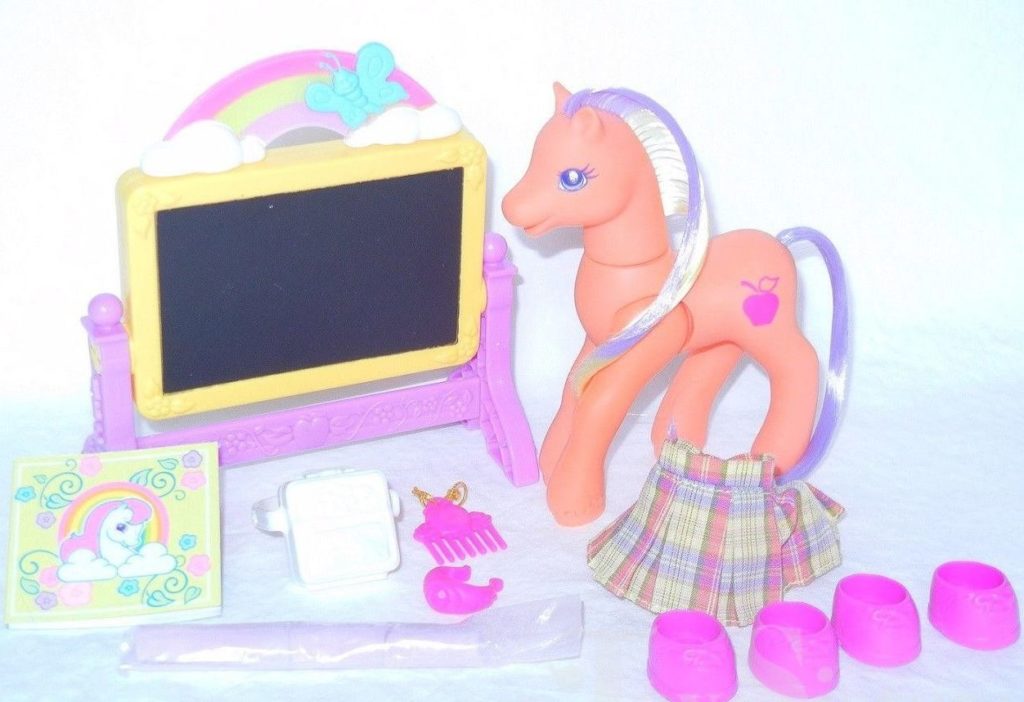 Bright Bramley was released in 1999. She came with a chalkboard, purple chalk, a checkered skirt, a white bag, four pink shoes, a pink ring, and a pink comb.