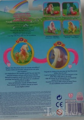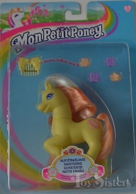 Nightshine was released in 2002. She came with two orange flower beads, two purple butterfly beads, and a yellow comb.