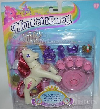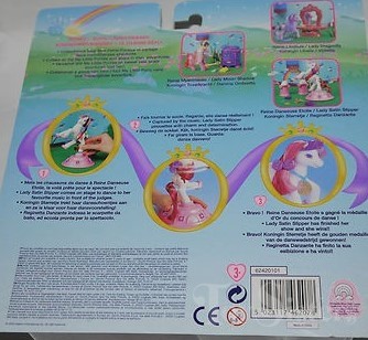 Lady Satin Slipper was released in 2000. She came with four pink shoes, a purple crown, a purple hair clip, a pink stand, two pink columns, a rainbow, a medal, three bracelets with ribbons, and a purple comb.