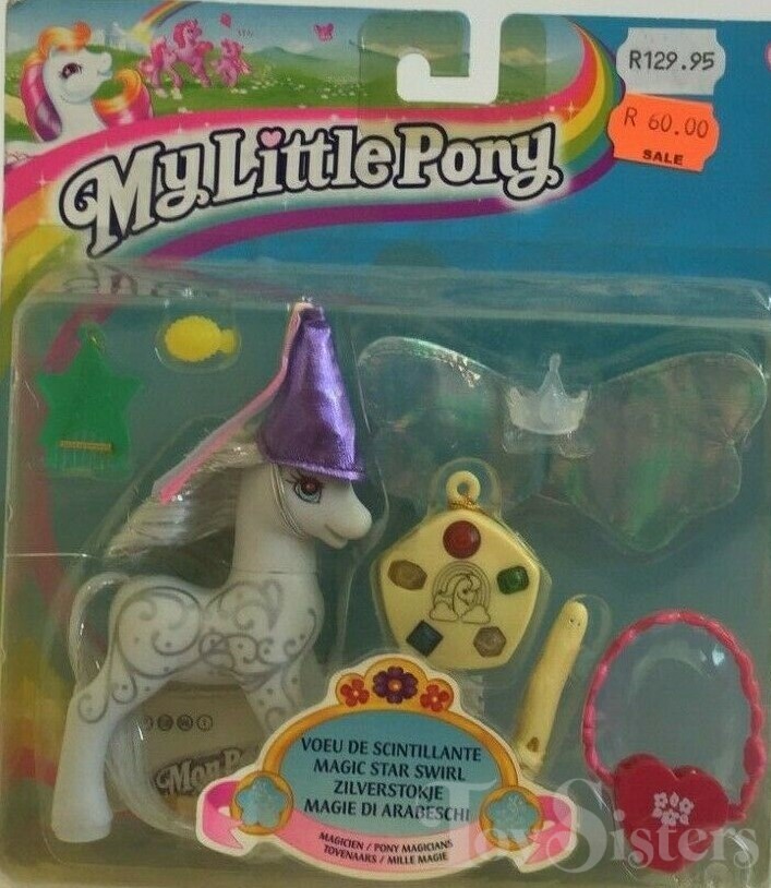 Magic Star Swirl was released in 2002. She came with a yellow ring, blue wings, red bag, purple princess hat, white crown, yellow wand, yellow amulet, and green star comb.
