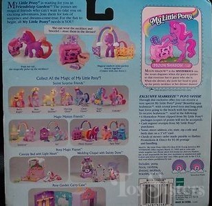 Moon Shadow was released in 1998. She came with a dresser, rainbow, purple necklace, purple bracelet, and hair comb.