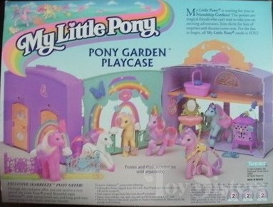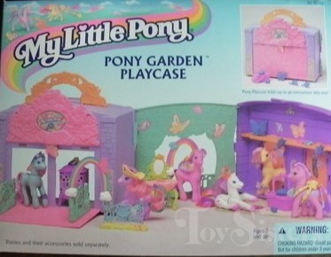 The Pony Garden Playcase was released in 1997. It used the same mold as the vintage Littlest Pet Shop zoo. It came with a pink butterfly, two green fences, pink pie, blue basket, pink apples, and two pink flower clips. In the U.S. it did not come with any ponies. In Spain, the playcase came with Seabreeze. The Spanish case was also in reverse colors.