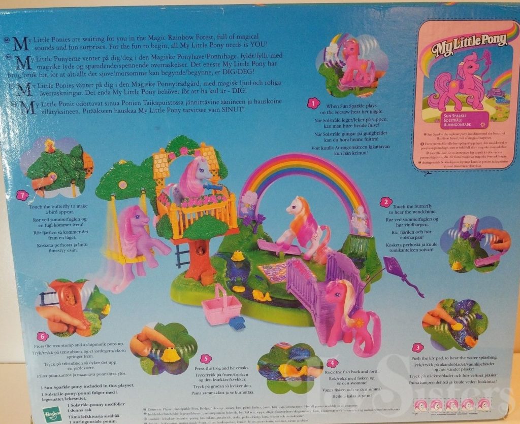 Sun Sparkle was released in 1999. She came with a Magic Rainbow Forest play set, pink basket, purple kite and kite holder, blue telescope, and a blue comb.