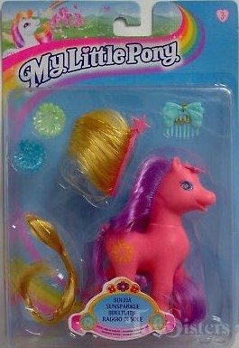 Sunsparkle was released in 2001. She came with purple and yellow hair pieces, a green and a purple hair clip, and a teal comb.