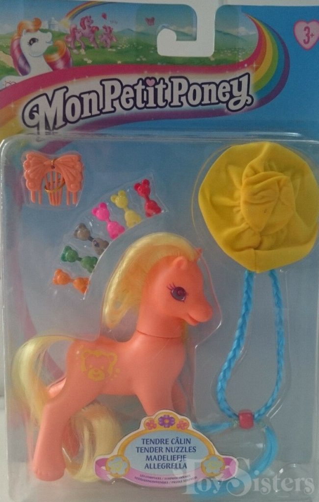 Tender Nuzzles was released in 2001. She came with six bear clips in green, pink, and yellow, a yellow hat with two blue braids, and an orange comb.