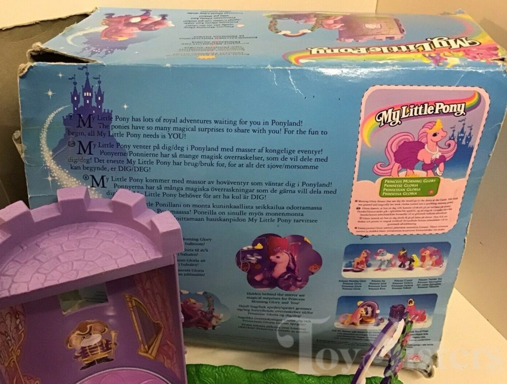 Princess Morning Glory was released in 1999. She came with a ballroom castle play set, a purple reversible dress with two reversible sleeves, four white shoes, a yellow crown, a blue checkered bandanna, a white necklace, a pearl necklace, a chair, a mirror brush, a yellow hair clip with attached pink hair, and a pink comb.