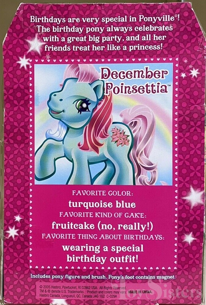 December Poinsettia was released in 2007. She is in the Wysteria pose. She is part of the Crystal Princess line and in the Toysrus exclusive Birthday Pony series.