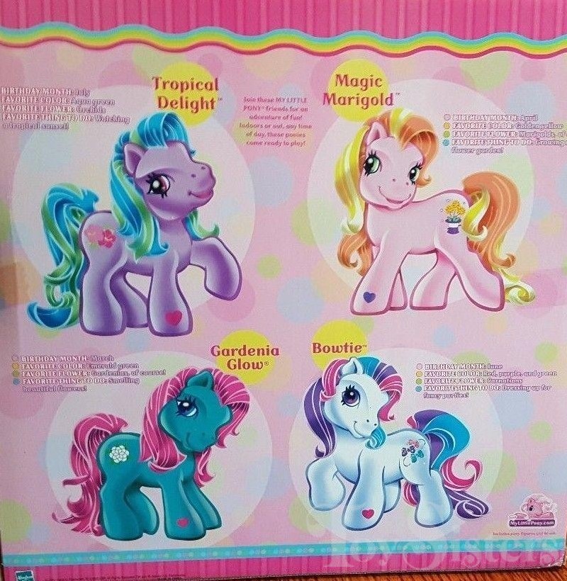 This version of Gardenia Glow was released in 2006. She came in a Toysrus exclusive 4-pack with Magic Marigold, Tropical Delight, and Bowtie. She is part of the 25th Birthday Celebration series, and is is in the Daffidazey pose.