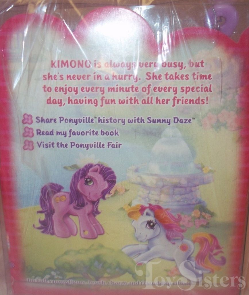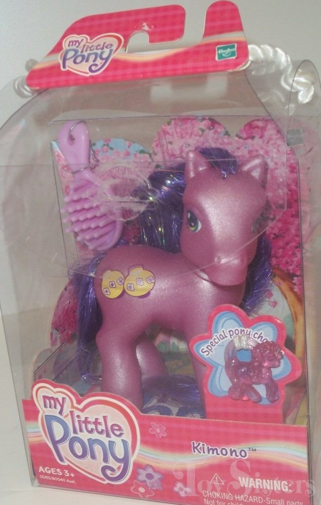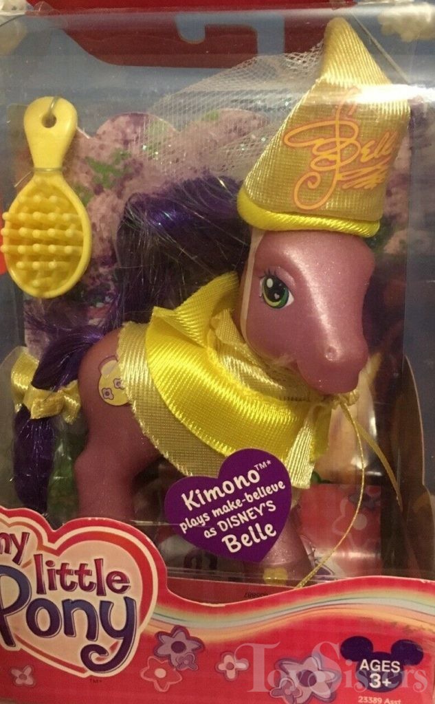 This version of Kimono was released in 2003. She was also sold in a Costco bundle with Minty, Pinkie Pie, and Sparkleworks. In 2004, she was sold at Disney Parks in a Princess Belle costume. She is in the Kimono pose.