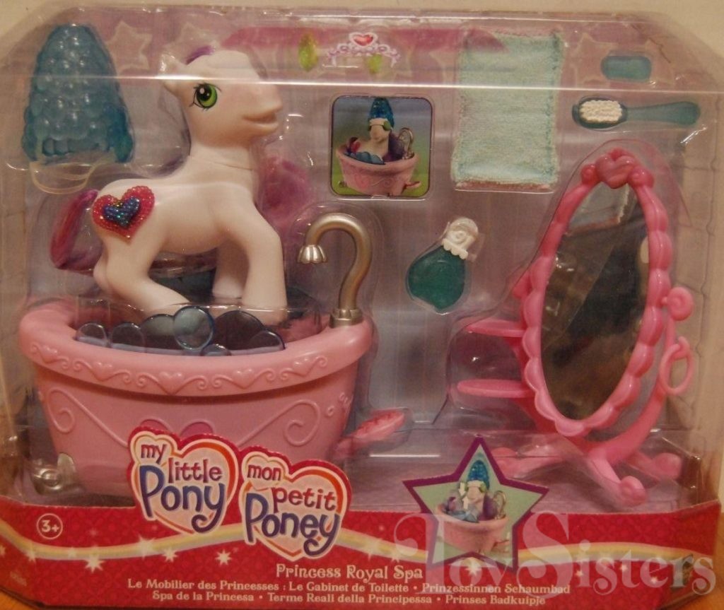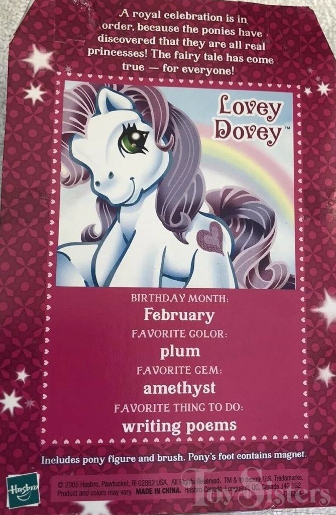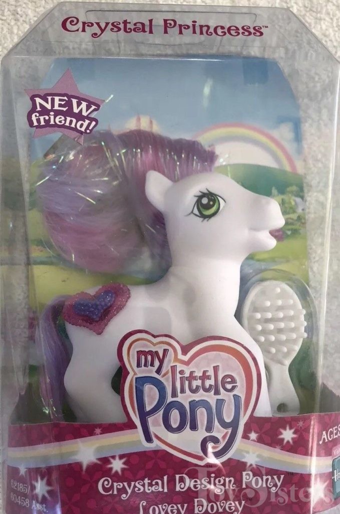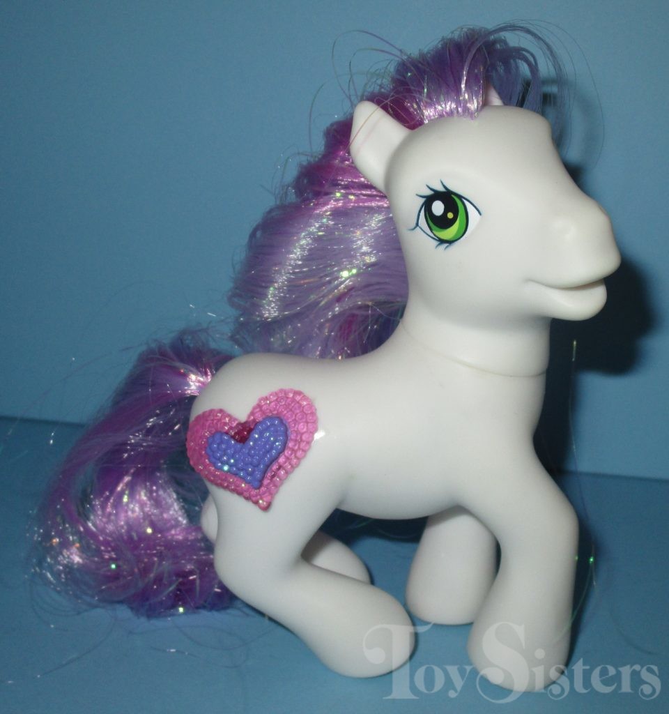 Lovey Dovey was released in 2006. She is a Crystal Design Pony in the Crystal Princess series. She has a symbol variation. In Europe, she also came packaged with the Princess Royal Spa furniture set. She is in the Peri Winkle pose.