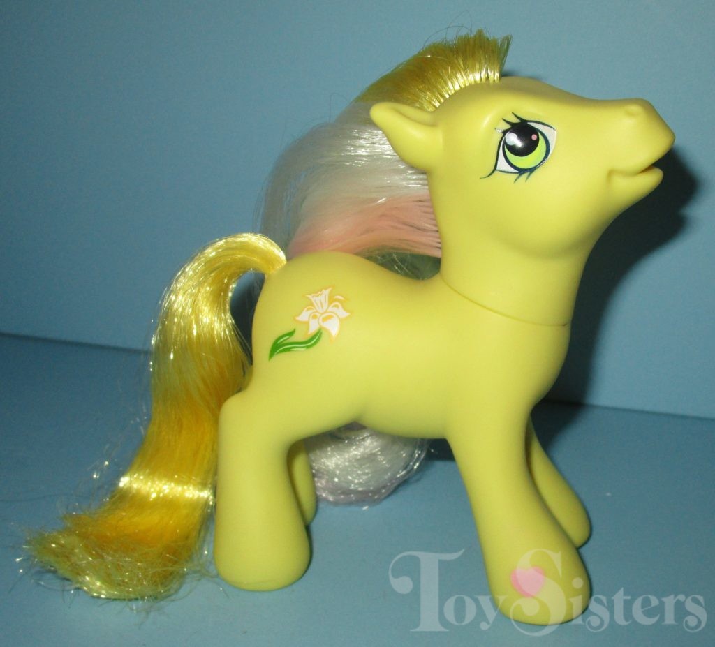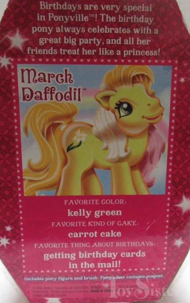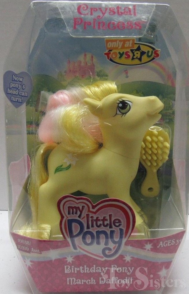 March Daffodil was released in 2006. She is in the Seaspray pose. She is part of the Crystal Princess line and in the Toysrus exclusive Birthday Pony series.