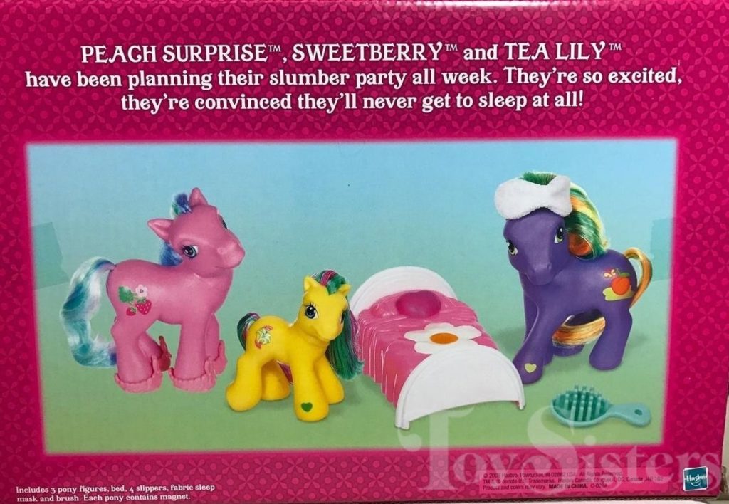 In 2006, Peach Surprise was released again in the Sleepover Dreams set with Tea Lily and Sweetberry. The hair on these ponies seems to fare better.