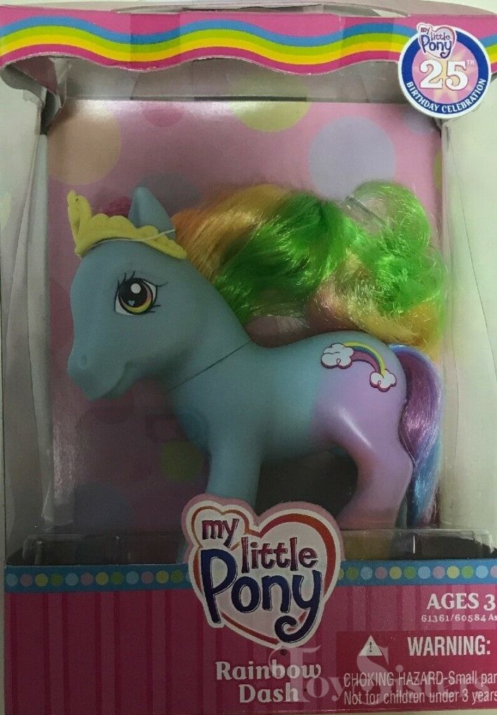 This version of Rainbow Dash was released in 2007 as a Favorite Friends Pony in the 25th Birthday Celebration series. She is in the Wysteria pose.