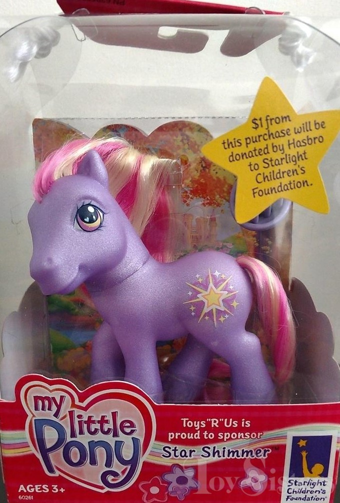 Star Shimmer was released in 2004. She was a Toysrus exclusive. With every purchase of Star Shimmer, Hasbro donated $1 to the Starlight’s Children Foundation. She is in the Rainbow Dash pose.