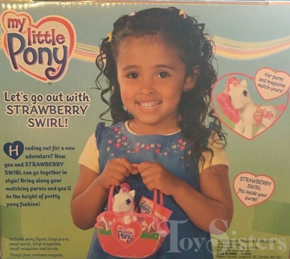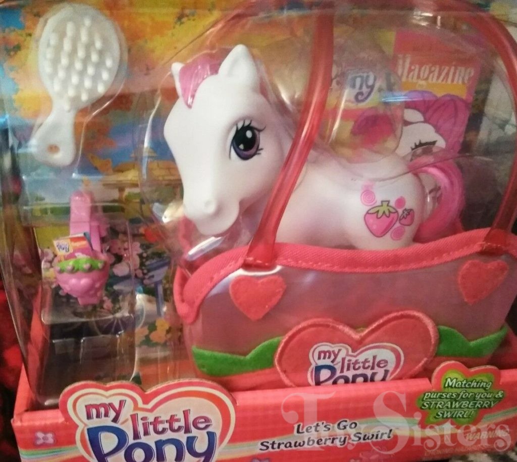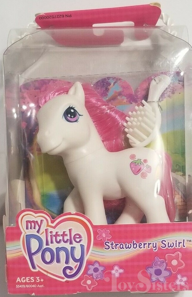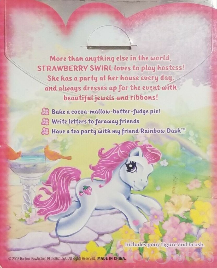 Strawberry Swirl was released in 2003. This version has a dark pink hoof heart. In 2005, she was released again in the Let’s Go purse. The version that came with the purse has a pink hoof heart. She is in the Rainbow Dash pose.