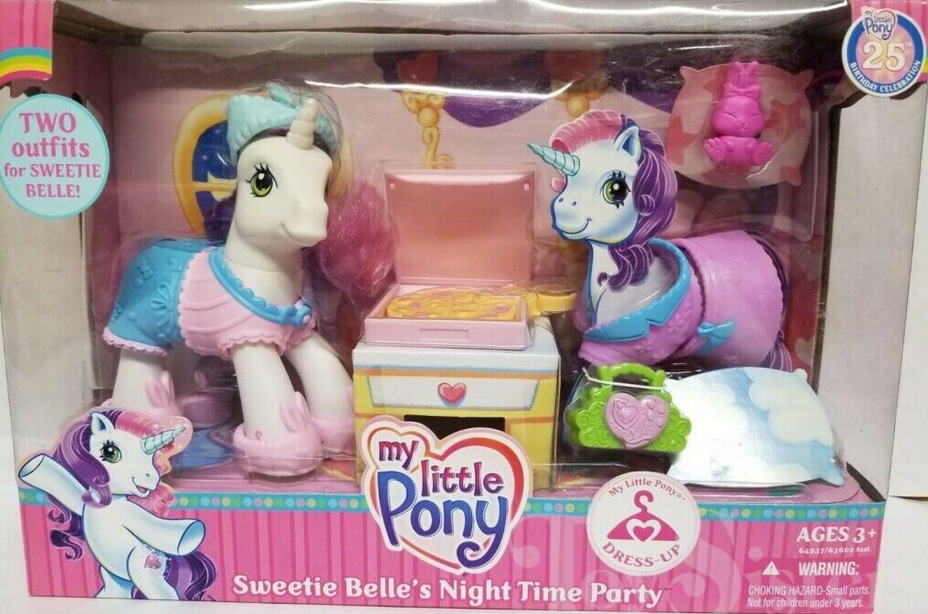 This version of Sweetie Belle was released in 2008 as a single in the Best Friends assortment, part of the 25th Birthday Celebration series. She was also released in Sweetie Belle’s Night Time Party. She is a Dress Up Pony in the Sweetie Belle pose.