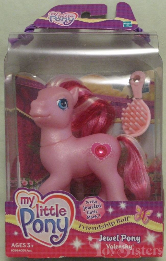 Valenshy was released in 2004. She was released again in 2006 in a bundle with Fancy Free. She is a Jewel Pony in the Friendship Ball series. She is in the Valenshy pose.