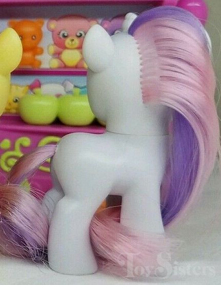 This version of G4 Sweetie Belle was released in the Fun at the Fair set. She has no forelock and her hair has one strip of purple at the top and one strip of pink on the bottom.