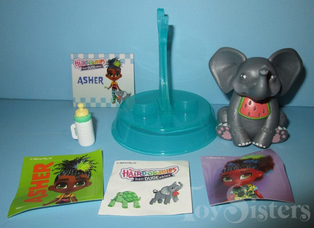 Elefun Asher was released in Hairdudeables Series Three. He came with an elephant, bottle, stand, name card, and series insert. The Series 3 Hairdudeables box was also used to sell an assortment containing Series 1 & 2 Hairdudables (no series 3 dudes were in the set even though they were on the box- it was very confusing). To return to Hairdudeables Series Three, click here. To return to the Asher character page, click here.