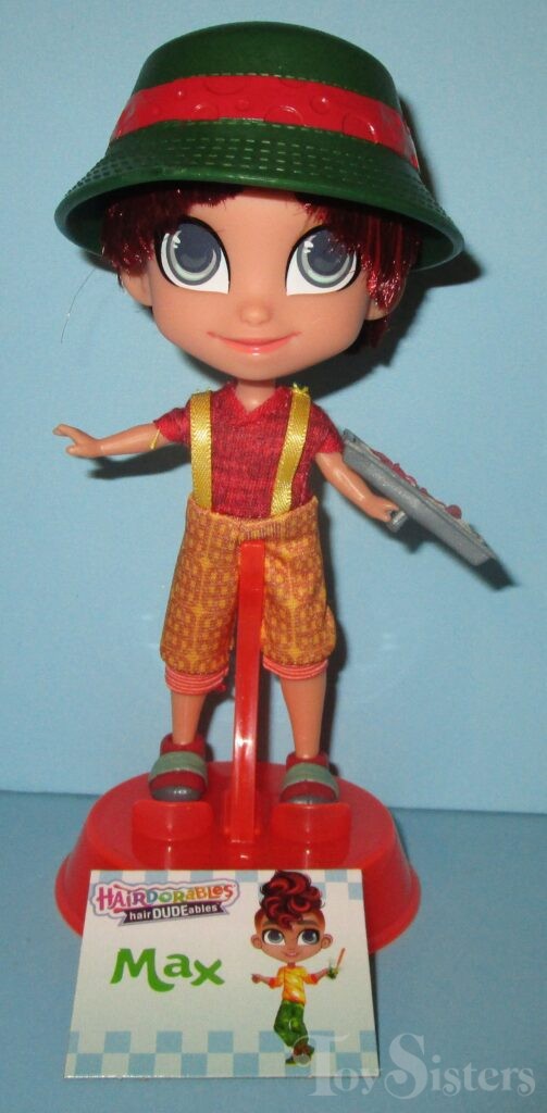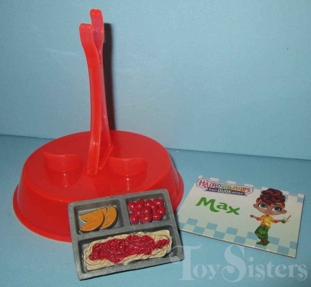 Lunchtime Max was released in Hairdudeables Series Three.  He came with a hat, food tray, stand, name card, and series insert.  The Series 3 Hairdudeables box was also used to sell an assortment containing Series 1 & 2 Hairdudables (no series 3 dudes were in the set even though they were on the box- it was very confusing).  To return to Hairdudeables Series Three, click here.  To return to the Max character page, click here.