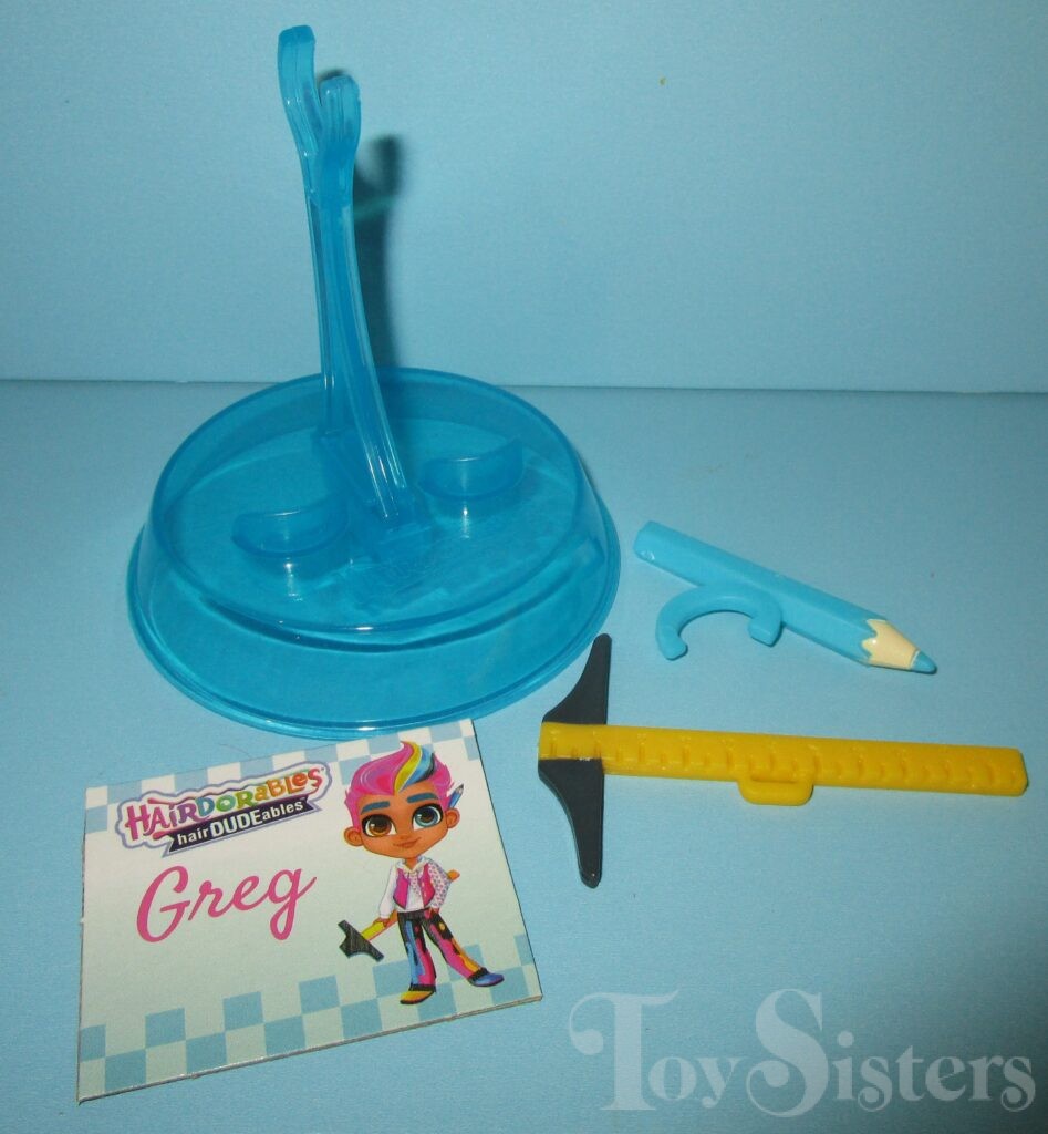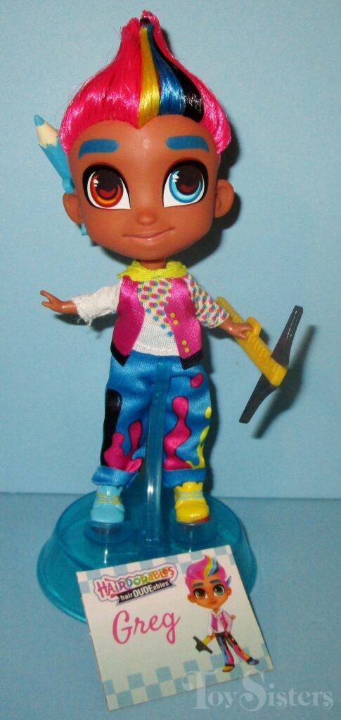 Splatter Paint Greg was released in Hairdudeables Series Three. He came with an accessory, pencil, stand, name card, and series insert. The Series 3 Hairdudeables box was also used to sell an assortment containing Series 1 & 2 Hairdudables (no series 3 dudes were in the set even though they were on the box- it was very confusing). To return to Hairdudeables Series Three, click here. To return to the Greg character page, click here.